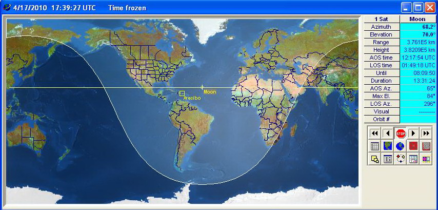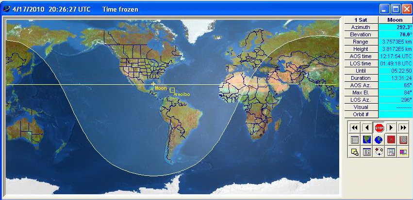 | These two screen shots show the moon moon coverage from the Arecibo 1000 foot dish during the time the moon is visible in Arecibo on April 17, 2010. The first picture shows locations reachable from Arecibo when they first acquire the moon and the second picture shows the locations just before they lose the moon for the day. The lightly shaded area shows where the moon is visible at the time shown at the top of each picture. |