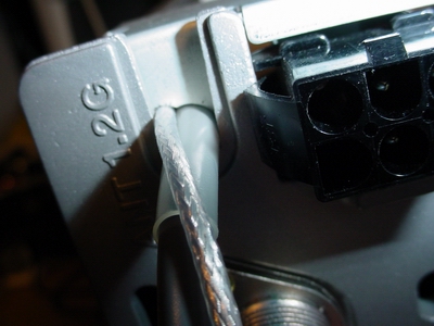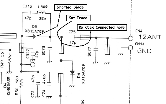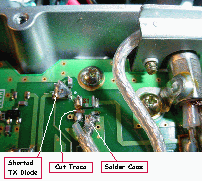 The trace is cut between the capacitor marked S1 and where the center conductor of the coax is soldered on. The TX diode is shorted out by a small piece of copper foil soldered across it. Remove the bracket shown in the upper picture and grind a small hollow into the upper side of the hole where the transmit feedline exits. Smooth the edges so it cannot cut your coax and clamp it back down over your new RX coax. Make it tight to provide strain relief. Here is the outside view: