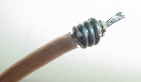 The center pin is enlarged and stiffened by soldering a short piece of solid bare wire alongside the stranded center conductor. Slightly larger solid bare wire (about #22) was wound around the shield and soldered in place to match the size of the jack that it plugs into. It only takes about a minute to make a connector like this and it works just fine.