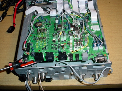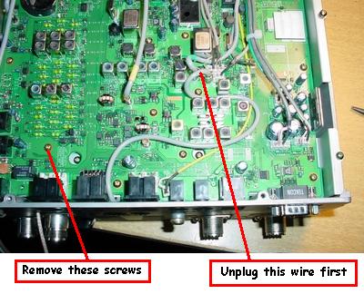 432 mods requires the bottom cover to be removed. Turn the rig upside down and remove the bottom cover. the PC board that you now see must be partially removed. You need to unplug one coax plug and remove the 17 tapping screws that hold down the board, and remove the ground clip on the right hand edge (see second picture below):