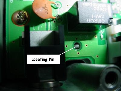 Once all 17 screws are removed, gently lift the board from the front until it is high enough to clear the locating pin at the rear of the board, shown below, and then slide the board forward until the connectors protruding through the rear panel are clear and the rear of the board can be raised.