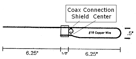 The boom is 1/2 X 3/4" wood. The elements are 1/8" diameter and have been made from Silicon Bronze welding rod, Aluminum rod, Hobby tubing, and solid ground wire. You really want to solder to the Driven Element. Silicon Bronze Welding rod, Hobby tubing, and #10 or #12 solid copper wire have been used to make the driven element. A drop of "Super Glue", Epoxy, or RTV is used to hold the elements in place. |